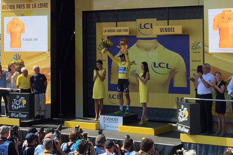Le champion du monde Peter Sagan (équipe Bora) a remporté la deuxième étape du Tour de France, a l’issue d’un sprint massif, et endossé du même coup le maillot jaune. Sagan s’est adjugé un sprint en petit comité après une chute collective dans le final qui a retardé le Colombien Fernando Gaviria, le vainqueur de la première étape. Sur le podium, le champion slovaque a été félicité par Laurence Garnier, vice-présidente du Conseil régional déléguée notamment à la culture et au sport. Elle s’est dite « très heureuse de participer au podium d’arrivée du Tour de France à La Roche-sur-Yon pour féliciter un champion d’exception, Peter Sagan, après une journée inoubliable aux côtés de Bernard Thevenet, double vainqueur du Tour. »