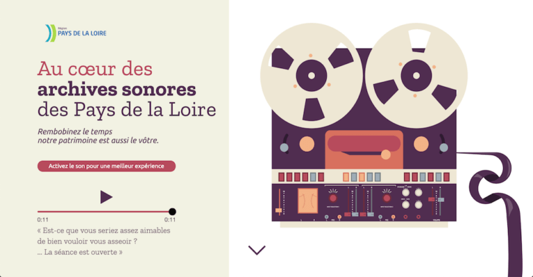 Nous vous invitons à découvrir cette réalisation en cliquant sur le lien suivant : http://apps.hyblab.fr/ddj2019/region-pdl-audio/ (allumez le son de votre ordinateur pour une meilleure expérience). Toutes les fonctionnalités ne sont pas activées – il s’agit d’un « prototype », mais permettent de découvrir et d’écouter quelques extraits : plongez au cœur des archives sonores dans le design préparé par ces étudiants !