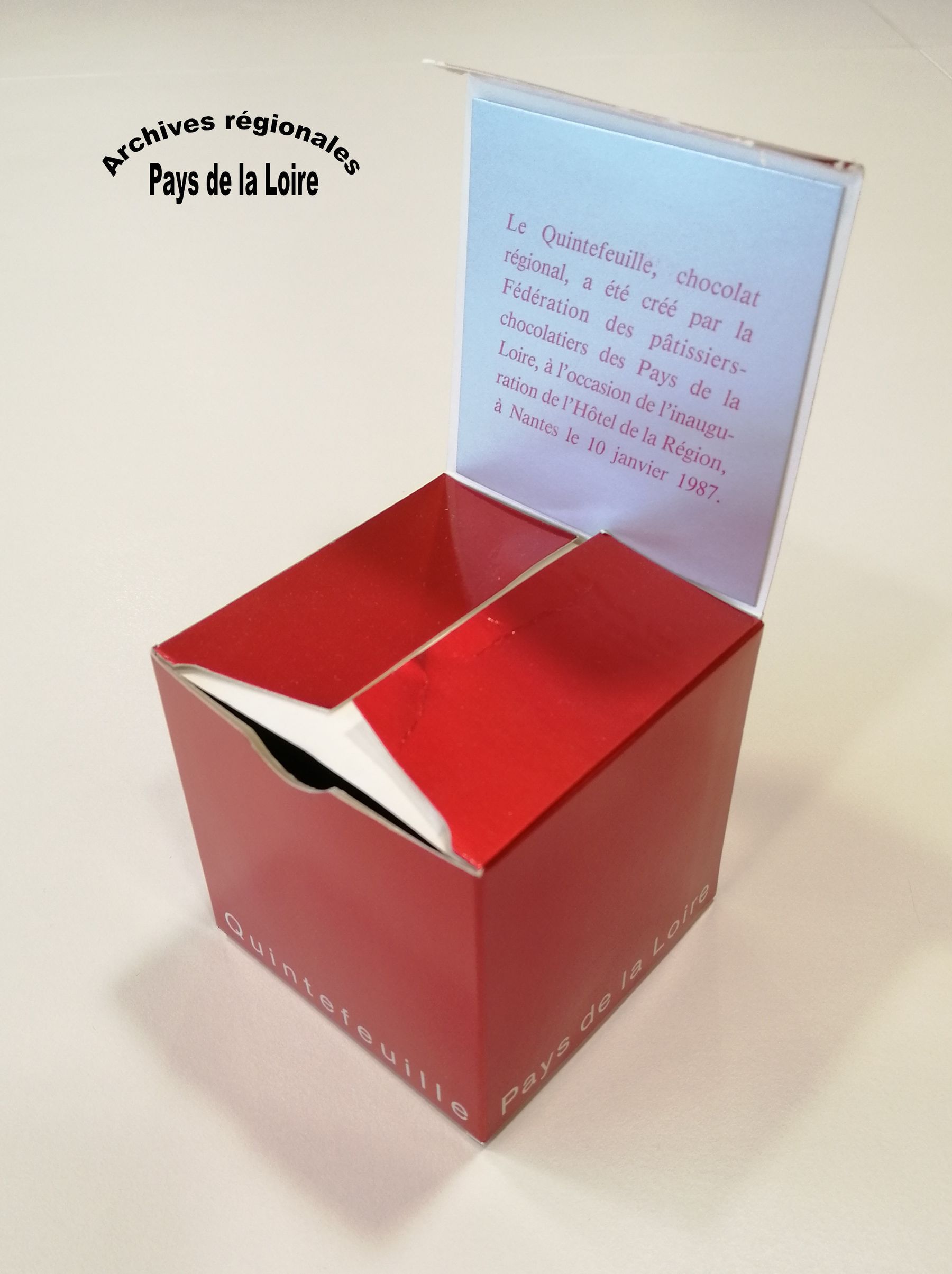Ce chocolat, baptisé Quintefeuille, a été conçu en 1986 par la Fédération des pâtissiers-chocolatiers des Pays de la Loire, à la demande du Conseil régional, pour l’inauguration de l’Hôtel de Région en janvier 1987. Après un concours dans chaque département, un jury régional a sélectionné une coque de chocolat noir enrobant une ganache framboise, fruit cultivé presque partout en Pays de la Loire.